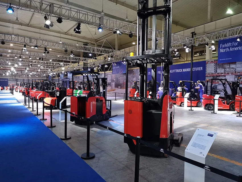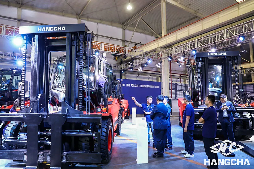 The new product display site was divided into a new product release area, a lithium product display area, North American product display area, a concept vehicle display area, a warehousing vehicle display area, a segmented market display site, a large-tonnage vehicle display site, an X-series electric forklift display area, an AGV demonstration area, a new energy product display area, an aerial platform display area ,an attachment display area, etc. Totally more than 200 sets of products and parts were displayed, and the industrial vehicles and core parts newly developed by Hangcha Group were centrally displayed to the dealers and customers.