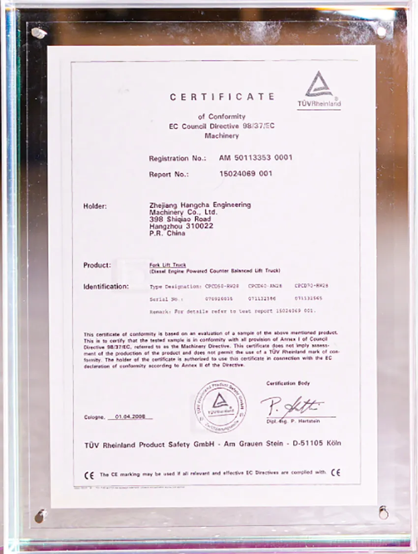 for HANGCHA Fork Lift Truck, Issued by TüV Rheinland in 2008