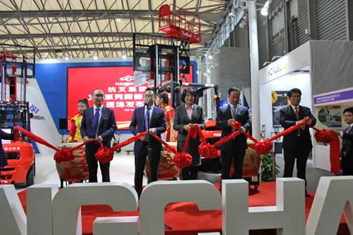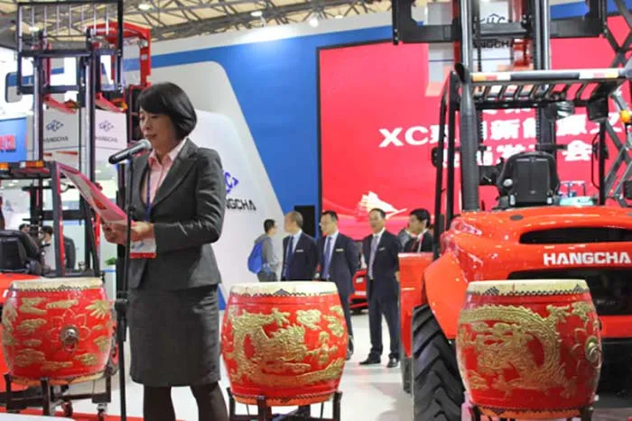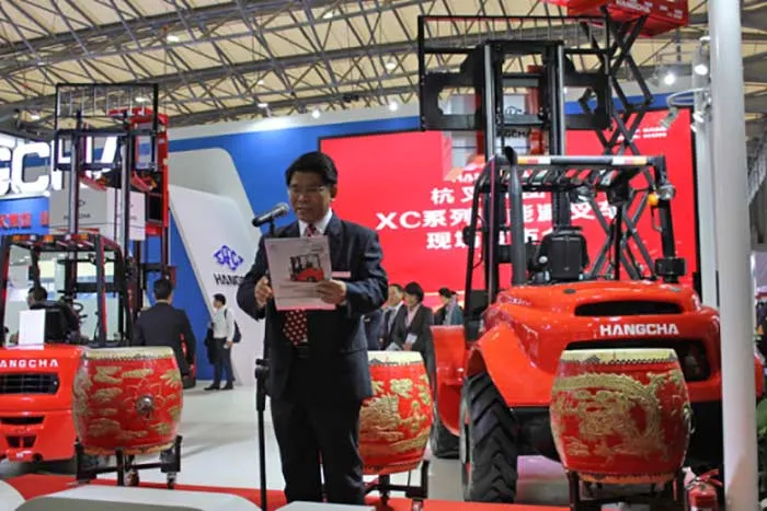 At 10:00, witnessed by the media, customer representatives, dealer representatives and many audiences, Zhang Jie, Secretary General of the Chinese Industrial Truck Association and Secretary of the Board, Marketing Director, Chief Engineer, Deputy Chief Engineer of Hangcha Group, presided the ribbon cutting ceremony and unveiled the XC series new energy forklift and C series lithium battery. Hangcha XC series new energy forklift not only highlight the advantages of Hangcha Group, but also reflect the efforts of Hangcha Group practicing the social responsibility of low-carbon life-style as a listed company, Zhang Jie said.