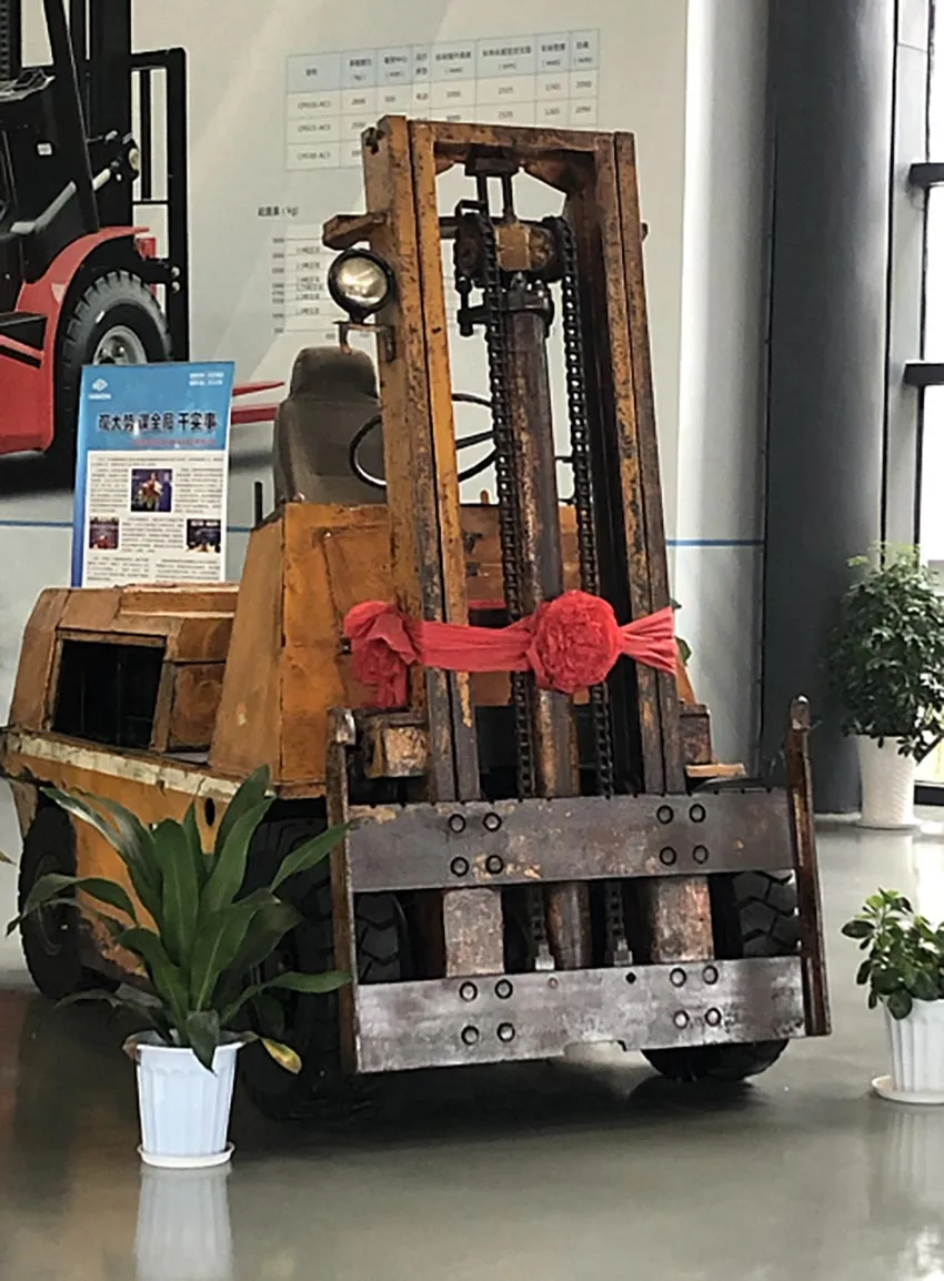 The first forklift made by Hangcha in 1974 still stands in the exhibition hall.