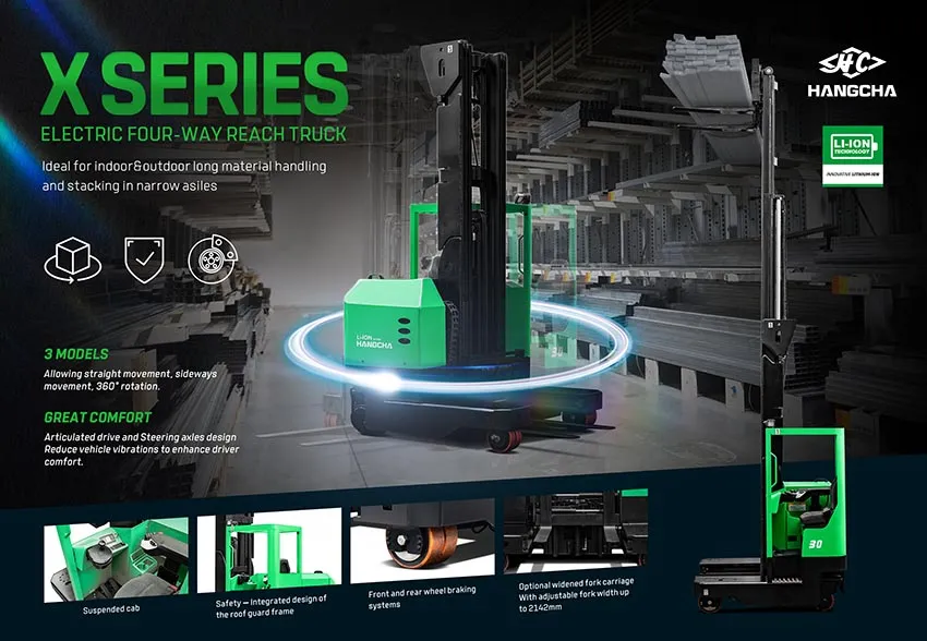 We are pleased to introduce our latest product specifically designed for handling long materials--the X Series Electric Four-Way Reach Truck with a capacity of 2,000 to 3,000kg and utilizes the 80V system, ideal for indoor and outdoor long material handling and stacking in narrow aisles.