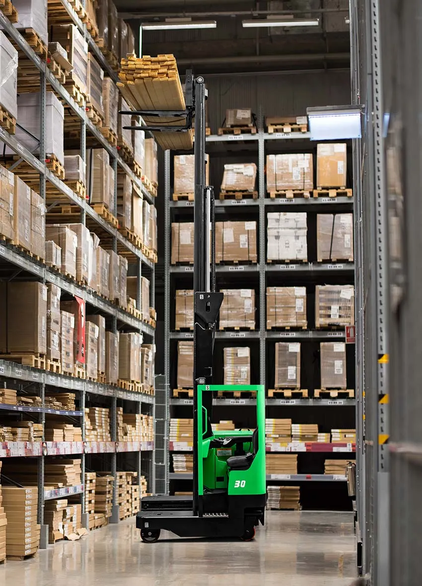 The X series electric four-way reach truck offers three flexible modes: 360° rotation, sideways movement, and straight movement, suitable for narrow aisles and limited spaces.