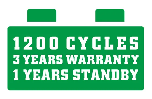 1200 cycles、3 years warranty and 1 year standby life;