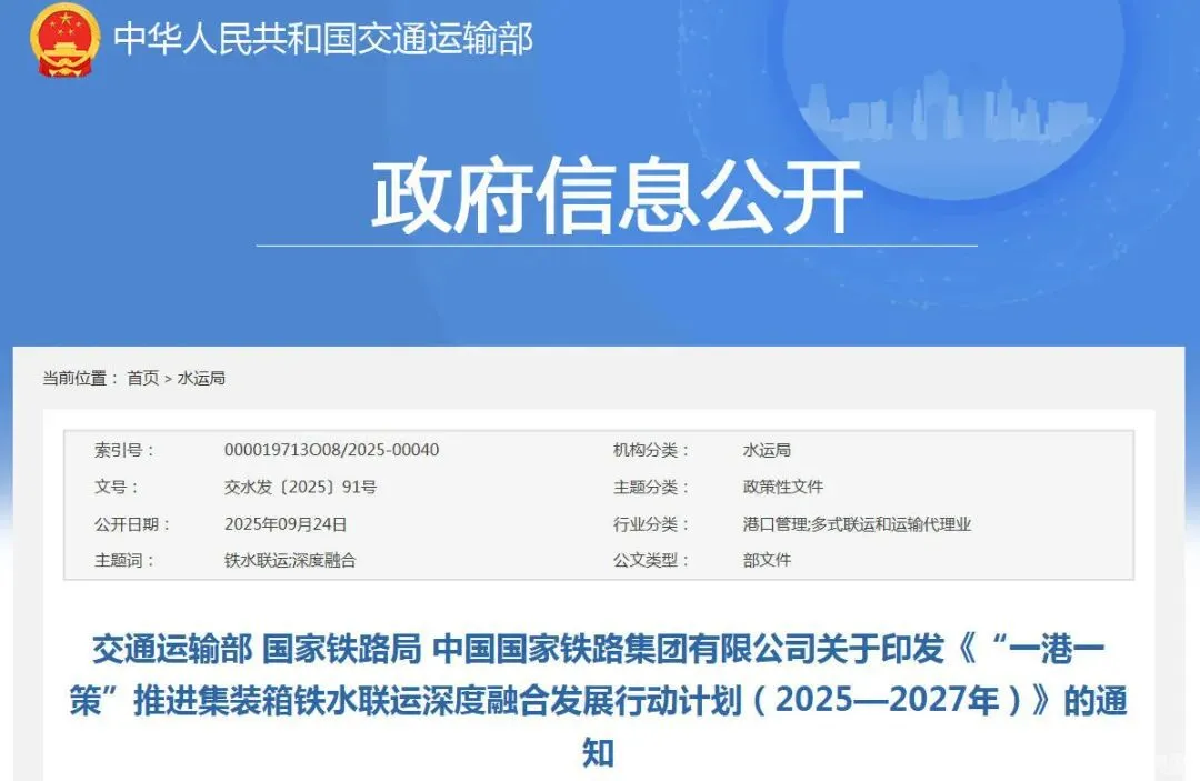 9月24日,交通运输部、国家铁路局、中国国家铁路集团有限公司印发《“一港一策”推进集装箱铁水联运深度融合发展行动计划(2025—2027年)》(交水发〔2025〕91号)(简称《通知》)。旨在优化调整运输结构,进一步发挥综合运输优势,促进有效降低全社会物流成本。